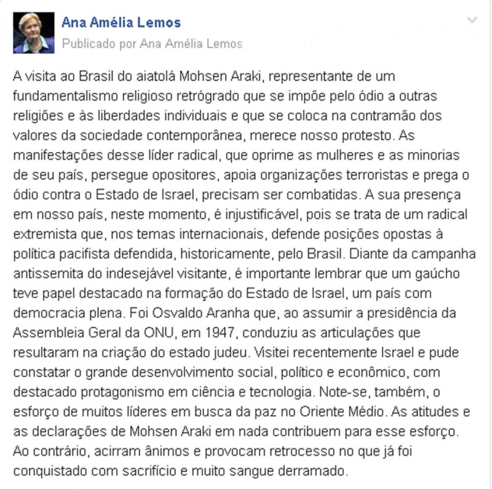 Ana Amélia critica vinda do Aiatolá Mohsen Araki ao Brasil