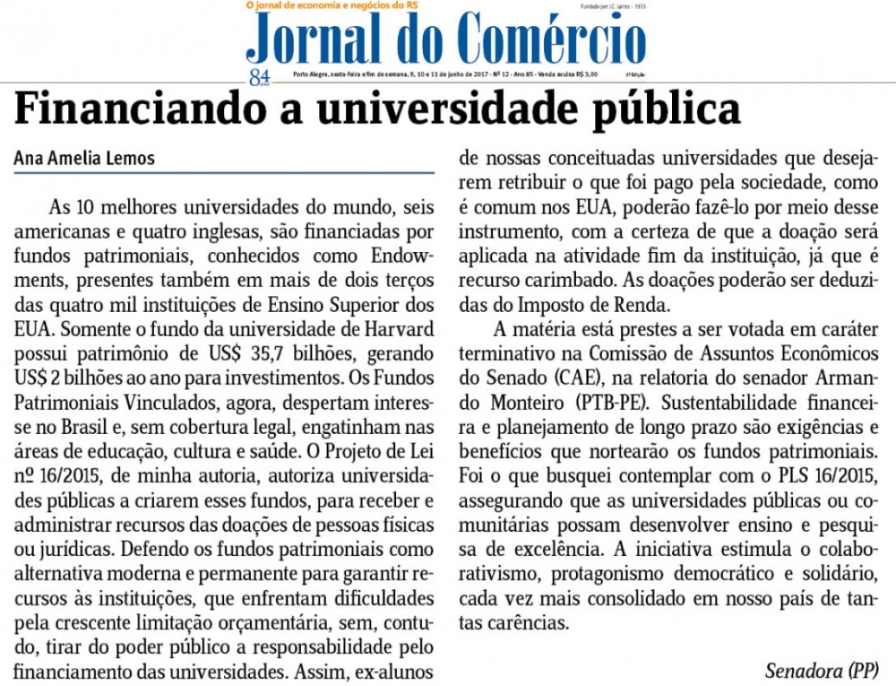 Em artigo no Jornal do Comércio, Ana Amélia destaca PL que cria fundos para universidades públicas e comunitárias